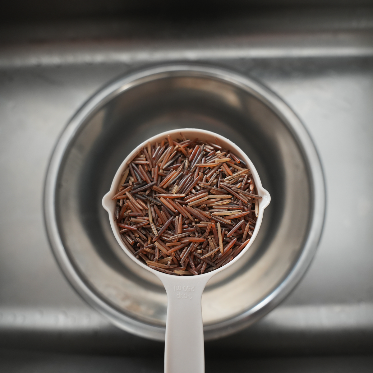 Rinse 1 cup of wild rice in cool water to remove any dust or loose hulls.